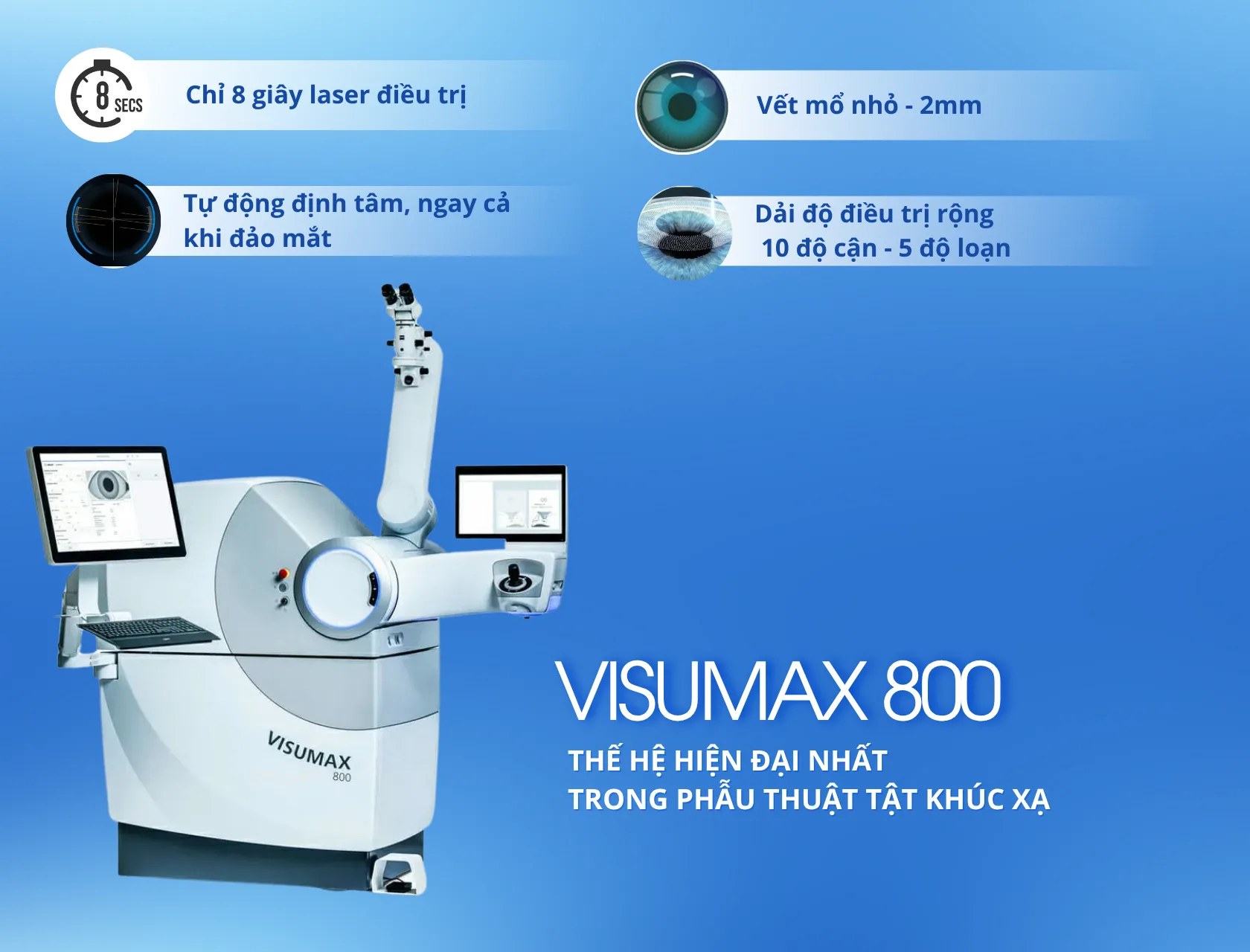 Trang bị hệ thống máy phẫu thuật khúc xạ tối tân nhất, bao gồm Carl Zeiss Visumax 800, giúp thực hiện các phương pháp phẫu thuật thế hệ mới như SMILE Pro và Femto-LASIK với độ chính xác tuyệt đối, thời gian hồi phục nhanh chóng.